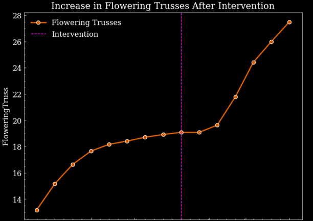 Example of a targeted intervention by a leading North America grower based on Gardin real-time insights. This single intervention led to an increase of 12 grams per plant. For example, the dotted line in the figure highlights when a leading strawberry grower made a targeted intervention. Gardin immediately detected the resulting productivity improvement, which translated into an increase of approximately 12 grams per plant per week. The ability to quickly validate and optimize decisions is a key driver of customer ROI.