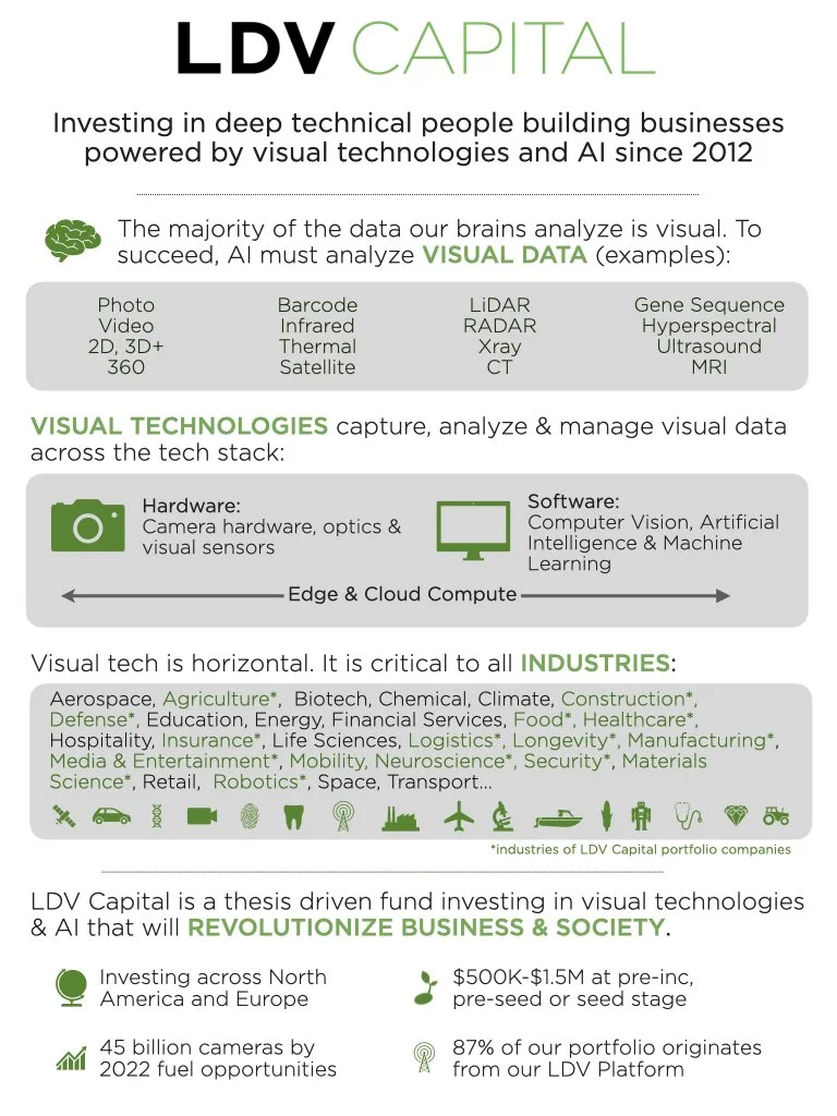 Since 2012, we at LDV Capital have been the only venture capital firm with a thesis of investing in people building businesses powered by visual technology.
